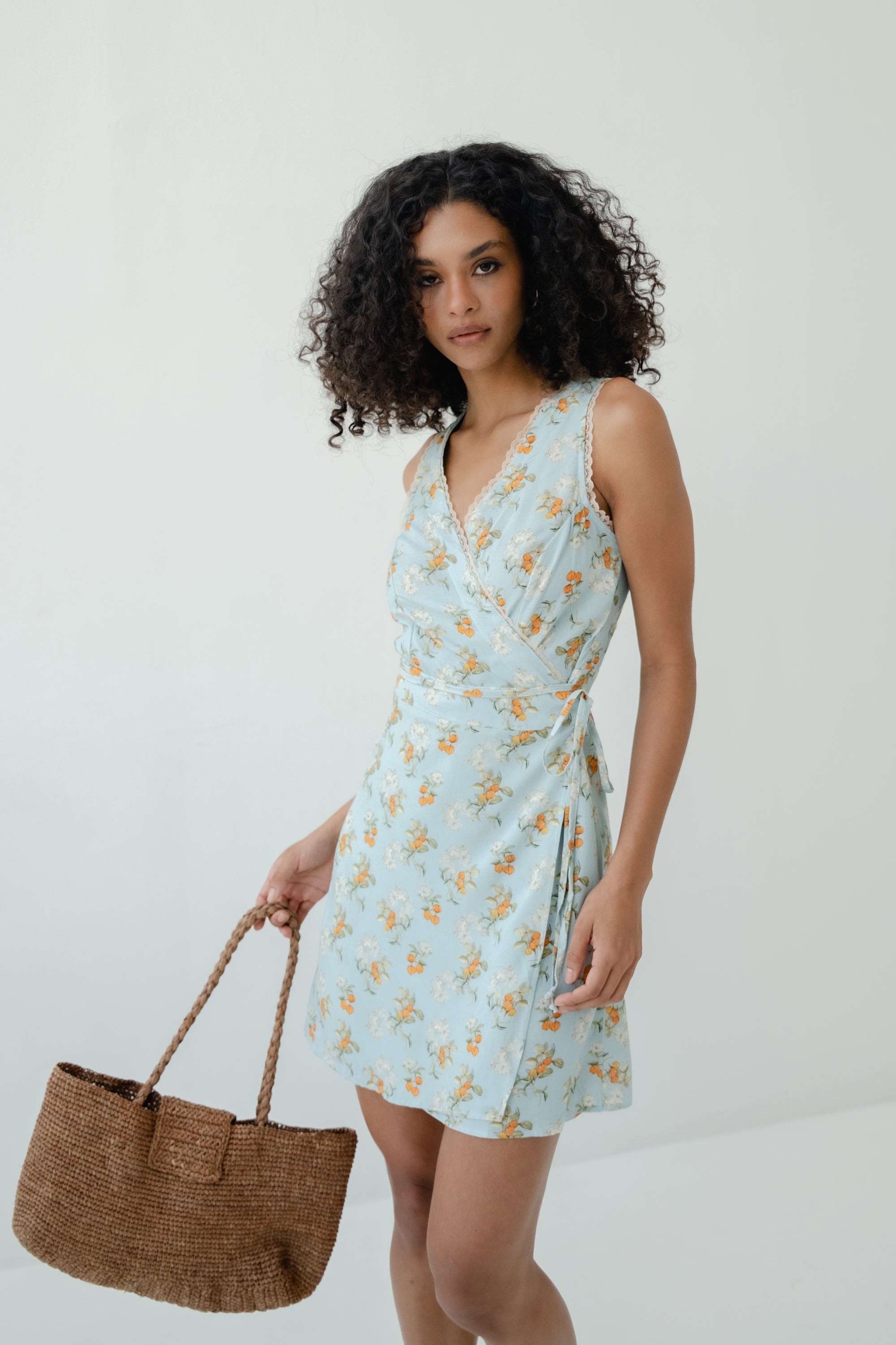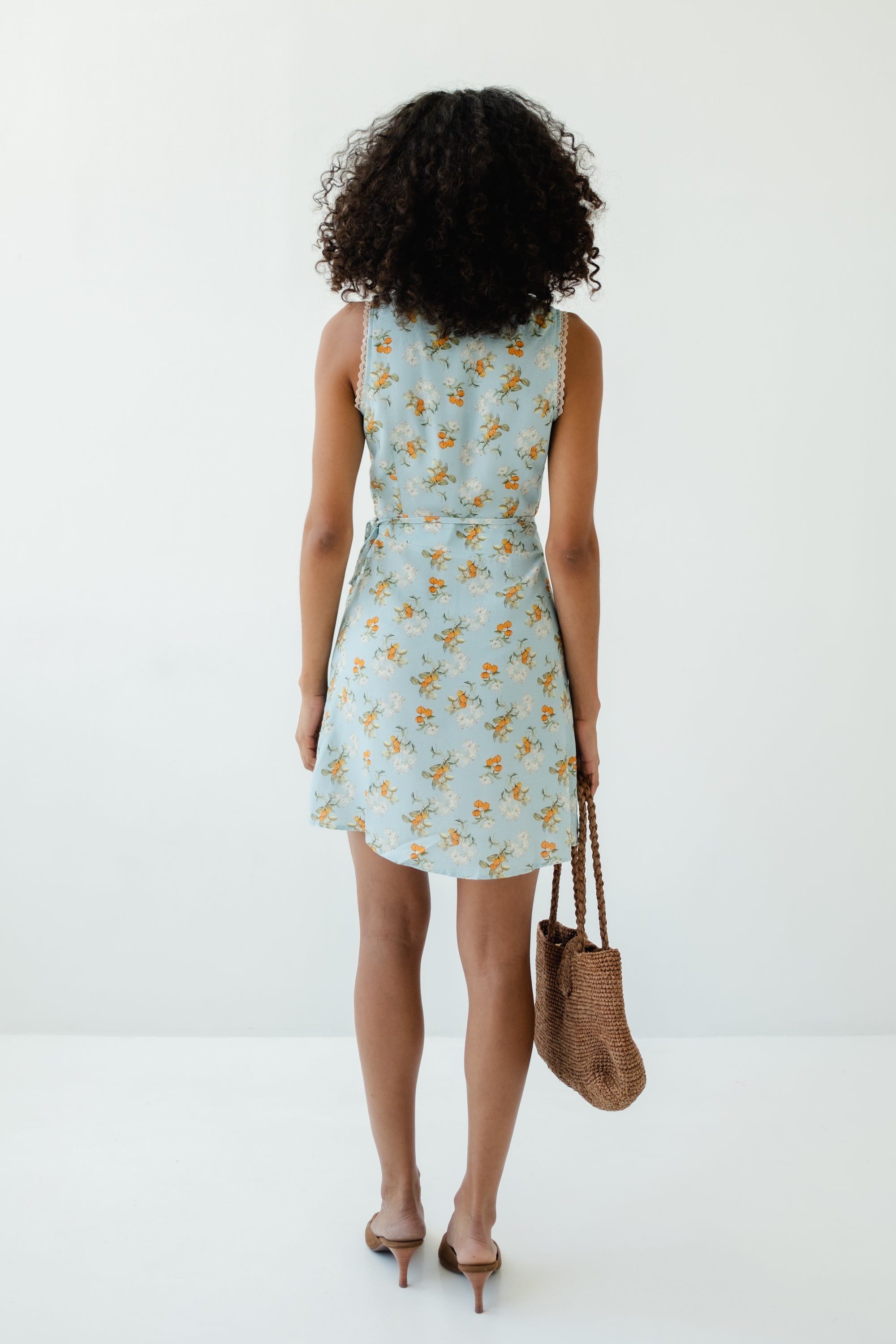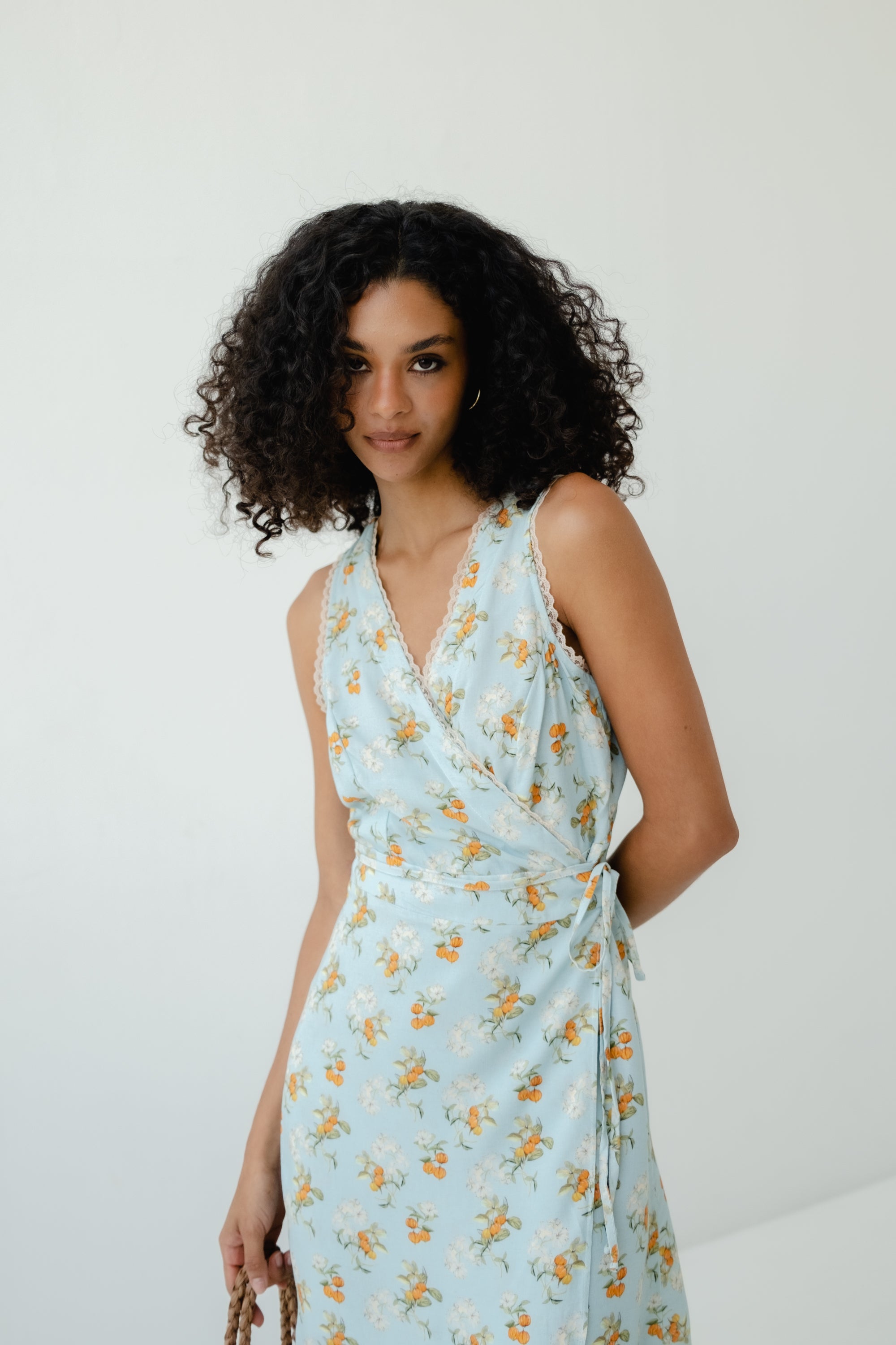 Vestido transpassado com ajuste interno por botões e externo por amarração.