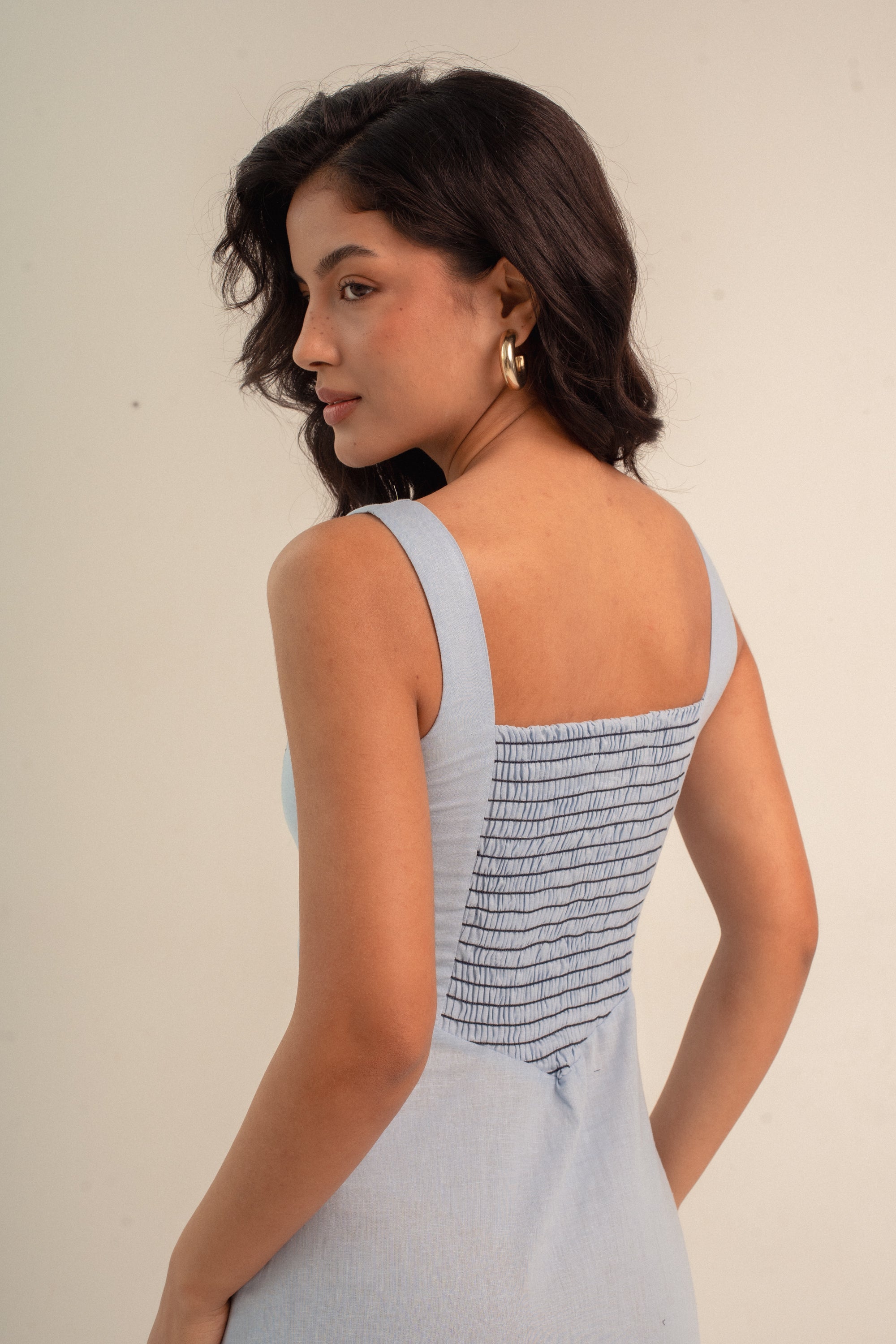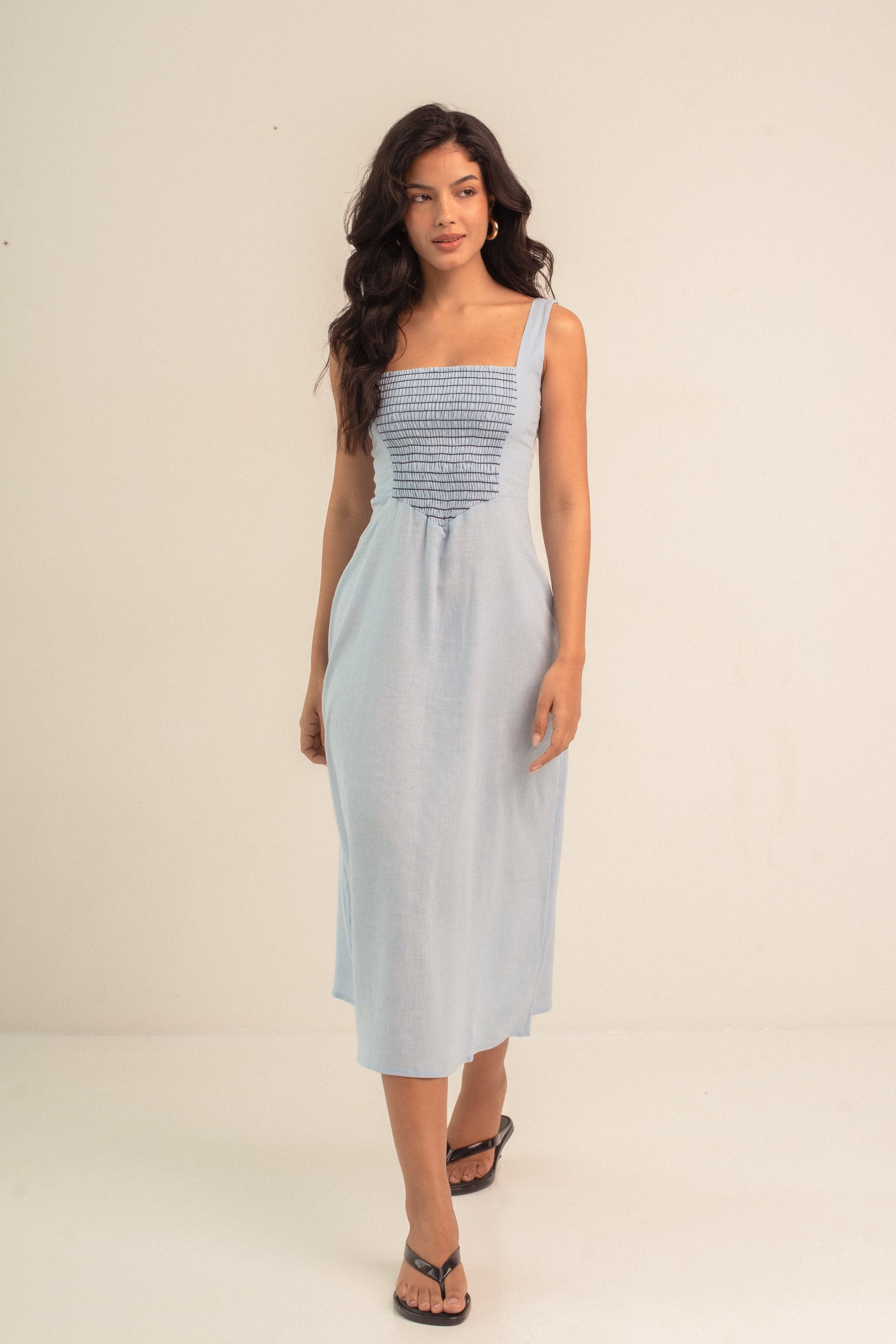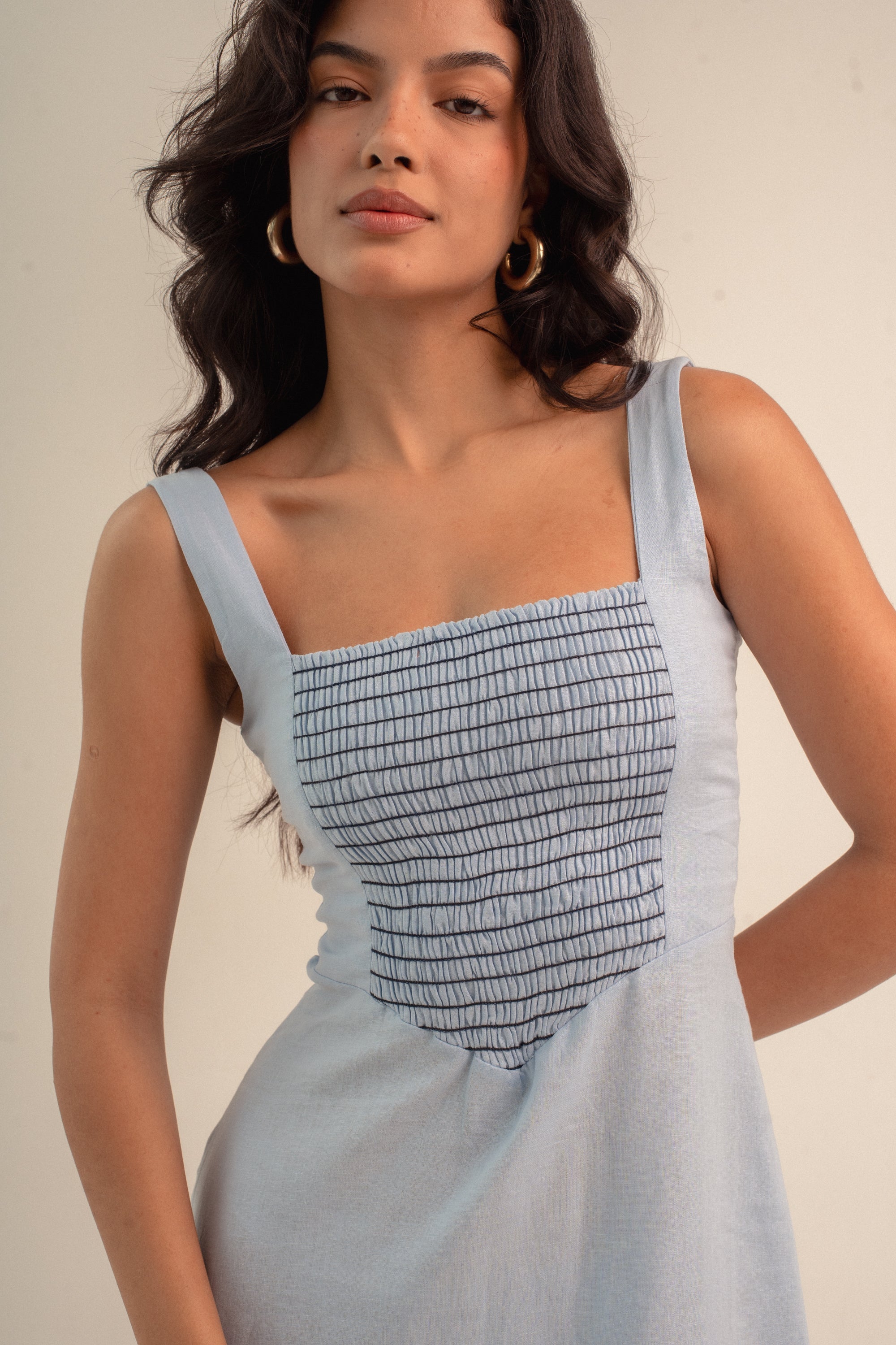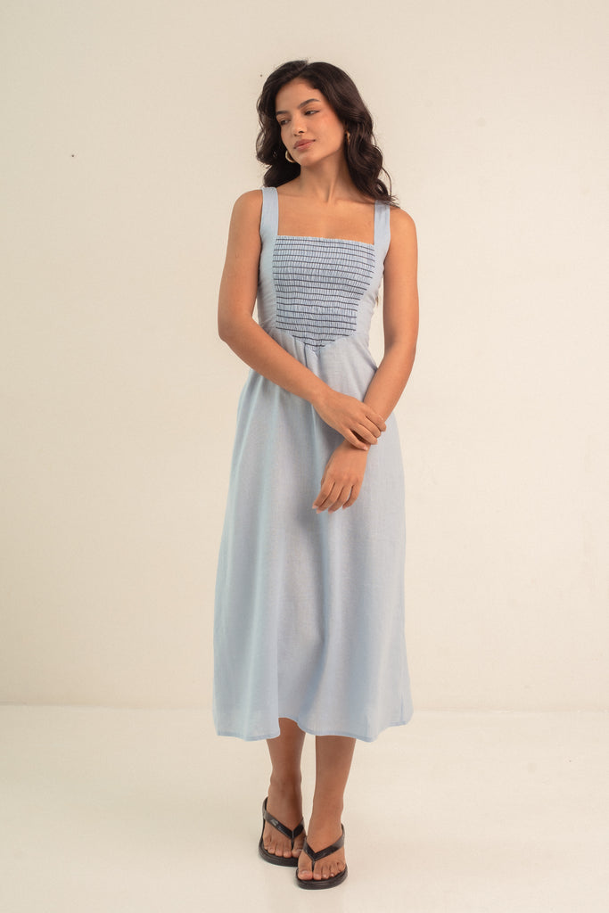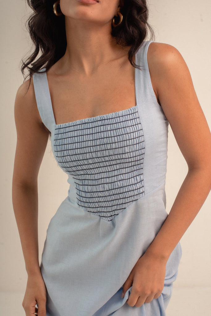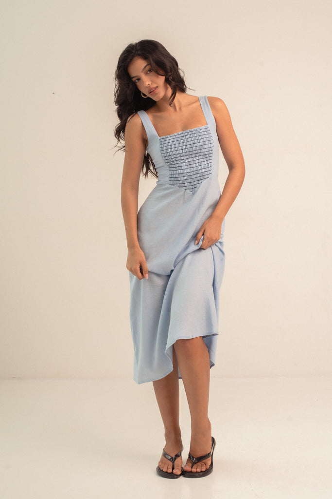 Para você começar a curtir o frescor do verão, nosso vestido Julieta veio em um azulzinho fresco no linho e com o detalhe do lastex em contraste. Ainda mais elegância e delicadeza para você vestir.
